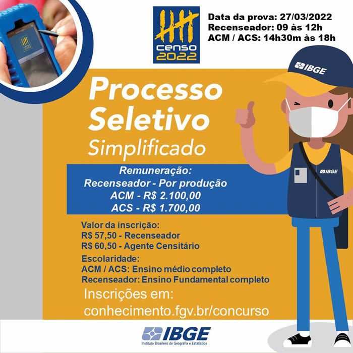 As inscrições estão abertas entre os dias 15 a 29 de dezembro de 2021. As provas serão realizadas em 27 de março de 2022, sendo que o candidato poderá se inscrever tanto para ACM/ACS, quanto para recenseador, pois a prova de recenseador será das 09h às 12h e a de ACM/ACS será das 14h30m às 18h.