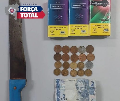 Após realização de buscas pelas localidades, os policiais militares localizaram o suspeito portando a arma branca mencionada, três maços de cigarro, junto com uma quantia de R$ 3,50, frutos do roubo.